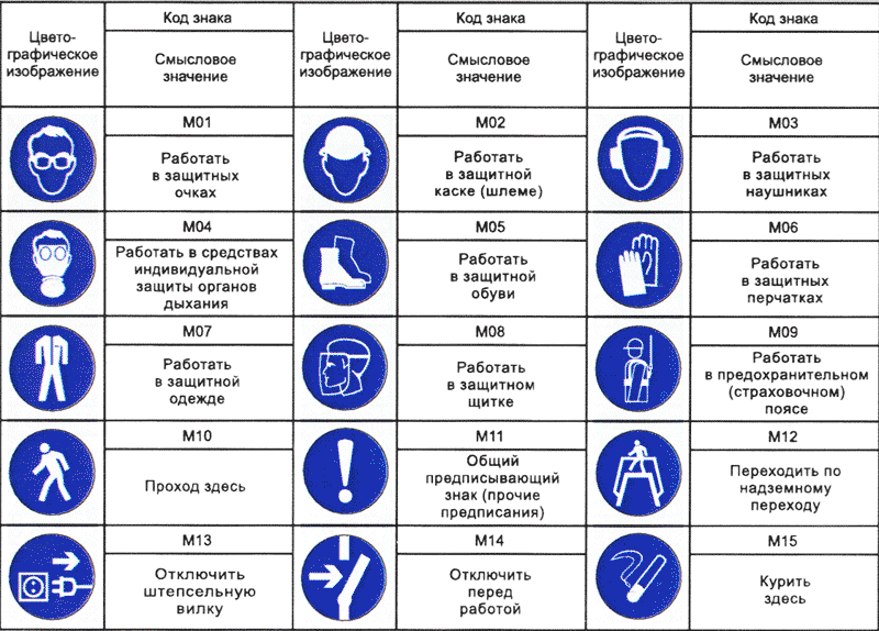 Эвакуационные знаки безопасности чаще других изготавливаются не в виде пленочных наклеек, а в виде подсвеченных коробов. Подсветку в идеале нужно подключить к бесперебойному питанию, чтобы в случае повреждения электросети люди все равно видели, куда нужно идти. По закону владелец помещения обязан сделать световым коробом только знак “Выход” и “Запасный выход”, а все остальные — на свое усмотрение. СигнальныеЗадача сигнальных табличек — сообщить человеку о местонахождении полезных при пожаре вещей: огнетушителя, телефона, кнопки пожарной тревоги, пожарного крана, охранного извещателя и так далее. Эти таблички всегда квадратные, а изображения на них рисуются белым по красному. В некоторых случаях (например, на знаке пожарного гидранта) фон белый, а изображение и рамка — красные. На самом знаке изображается искомый предмет и/или стрелка, указывающая в его направлении. Предписывающие Предписывающие знаки сообщают людям, как нужно себя вести в помещении согласно правилам безопасности (в том числе пожарной). Предписывающие знаки всегда круглые, рисуются белым по синему, как большинство дорожных знаков. На предписывающих знаках изображены защитные аксессуары (каска, очки, защитная роба и так далее) или правила использования оборудования. Предписывающие знаки всегда устанавливаются рядом с опасными механизмами или в опасных зонах, где необходимо соблюдать технику безопасности. Вот несколько примеров: - работа в защитных перчатках; - необходимость использования страховочного пояса; - работа в защитном щитке; - переход по надземному переходу.
