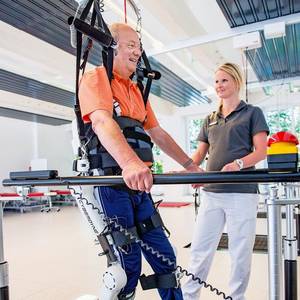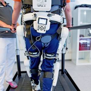 Бохум. Скрип механических соединений, шум электродвигателей. Пол Ханнес еле передвигается по беговой дорожке. Человек, ростом 1,80 м, бывший офицер полиции, носит роботизированный костюм. Тем не менее, это выглядит весьма угловато. Но Ханнес радуется, глядя на дисплей устройства: «Я прошел 100 метров за четыре минуты, это лучше, чем в прошлый раз». Ханнес уже 2 года страдает параличом нижних конечностей. После операции отек зажал нерв в спинном мозге и он перестал чувствовать тело ниже груди, все оказалось неподвижным. С тех пор, последние месяцы он непрерывно тренируется ходить с роботизированным костюмом. И он достиг прогресса в лечебном центре при университетской больнице Бергманшейль в городе Бохум. Парализованные снова могут ходить. Высокие технологии воплощают библейские пророчества, по крайней мере, частично. Медик Деннис Грасмюке из университетской клиники опасается возлагать большие надежды. "Экзоскелет является огромным шагом вперед для реабилитации страдающих параличом нижних конечностей. Но мы не творим чудеса ". Все же, четверти пациентов он может принести пользу. Уже 90 пациентов лечат по новой технологии. Использование роботизированных костюмов помогает поднимать тяжести или работать в неудобном положении, например, на заводах, они удерживают реабилитационных больных на ногах. При условии, конечно, что здоровые мышцы и нервы все еще присутствуют в парализованных частях тела. В таком случае многие больные люди в некоторой степени могут научиться ходить нормально. Под наблюдением докторов в г. Бохум сейчас находится 90 пациентов в нейроцентре для восстановления движения, используя экзоскелеты японского производителя Cyberdyne. В процессе реабилитации дееспособные мышцы становятся сильнее, увеличивается их подвижность. Роботизированные костюмы, известные как экзоскелеты, помогают встать на ноги человеку с частичным параличом. Архитектор с параличом нижних конечностей снова может работать, пострадавшая от аварии всадница теперь сидит в седле и готова учиться. И пенсионер Пол Ханнес также в настоящее время преодолевает короткие расстояния с опорой-ходунком. С помощью врачей он добился успеха, и теперь десятиметровое расстояние он преодолевает за 20 секунд. Профессор Йошиюки Санкай университета Цукуба в Японии разработал роботизированный костюм с символом HAL. Компания Cyberdyne продает устройства по всему миру. "Особенность этого экзоскелета в том, что он находится под контролем и управлением нервных импульсов пациента" - объясняет медик Грасмюке. Перед тренировкой пациенту крепят девять электродов на ноги. Ханнес вынужден терпеть эту процедуру. Электроды охватывают импульсы функционирующих нервов, которые ведут к не парализованным мышцам. Установленный в костюме компьютер преобразует эти сигналы в команды управления для двигателей, которые в свою очередь поддерживают мышцы. Таким образом, происходит процесс обучения собственного тела. Примерно 60 экзоскелетов фирмы Cyberdyne используются по всей стране, наряду с Бохумом, в двух больницах в Берлине и в Галле, Франкфурте и Адорфе (Саксония). Здесь 8 больниц используют костюмы калифорнийского производителя Ekso Bionics для тренировки и реабилитации. Совсем для другой цели разработаны роботизированные костюмы израильской фирмы Argo-Medical Technologies, и новозеландский Rex Bionics, а т