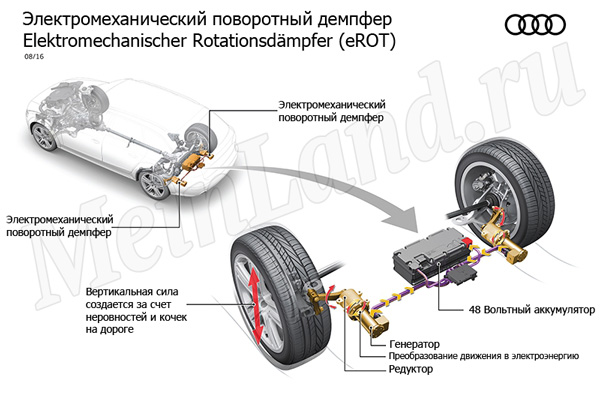 Немецкая автомобилестроительная компания Audi AG представила свою новую разработку, которая позволит производить дополнительное электричество для авто. Инновационная система электромеханической роторной подвески Erot сделает поездку не только более комфортной, но и поможет сэкономить. Данная технология способна компенсировать неровности на дороге без наличия вертикальных амортизаторов. Кроме того, подвеска будет получать электроэнергию за счет раскачивания на кочках и других неровностях. С помощью зубчатых колес и специальных рычагов движения Erot сможет собирать кинестетическую энергию, производя электричество. По словам разработчиков, роторная подвеска Erot позволит возвратить около 150 Ватт энергии, однако не мало важным фактором здесь является качество дорог. Предположительно, максимальный показатель возврата может превысить отметку в 600 Ватт. Известно, что компания AUDI AG собирается в скором времени оснастить свои автомобили данной технологией. |